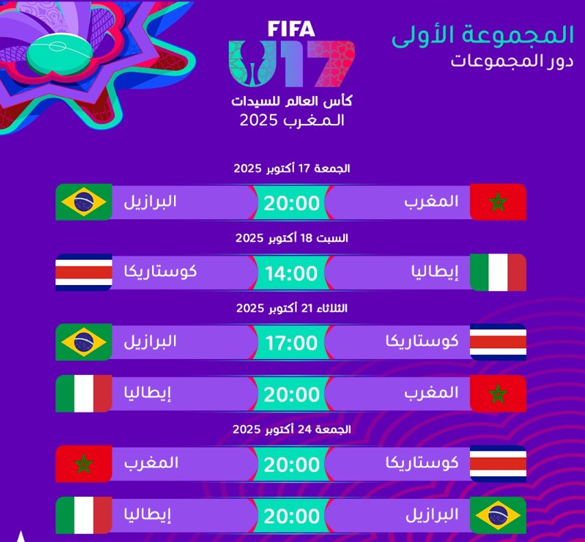 وسيخوض المنتخب المغربي غمار المونديال ضمن المجموعة الأولى إلى جانب البرازيل، إيطاليا، وكوستاريكا، حيث يفتتح المنافسة بمواجهة أمام المنتخب البرازيلي اليوم الجمعة على الساعة الثامنة مساء بالملعب الأولمبي بالرباط، الذي سيحتضن مباريات هذه المجموعة، إلى جانب أكاديمية محمد السادس بسلا التي ستستضيف جزأً من اللقاء ات وتستمر المنافسة إلى غاية 8 نونبر بمشاركة 24 منتخبا.